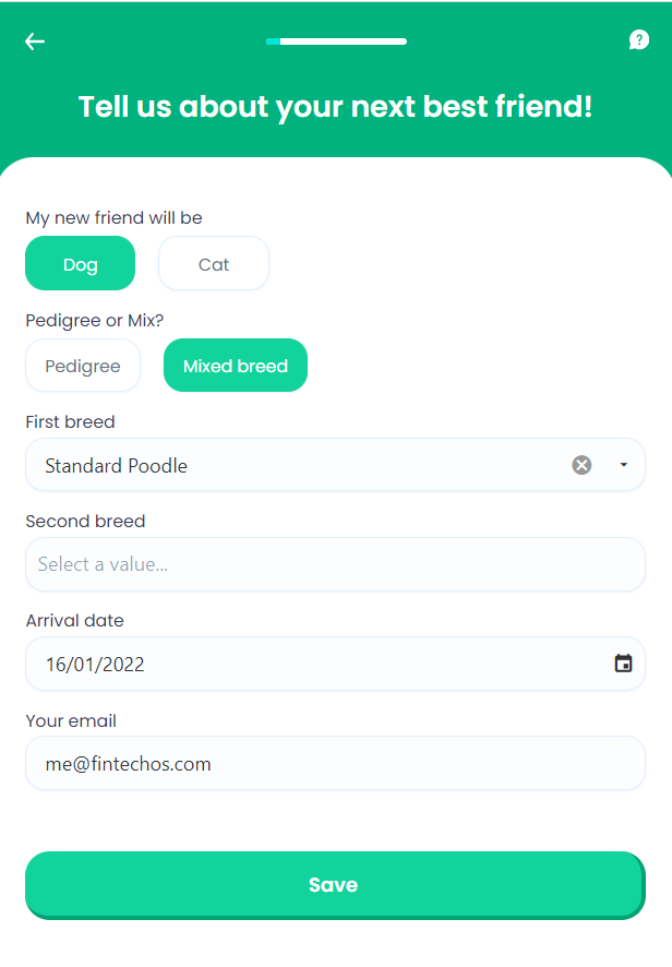 | Heading Title | The following heading title is displayed in the header section: Tell us about your next best friend! |