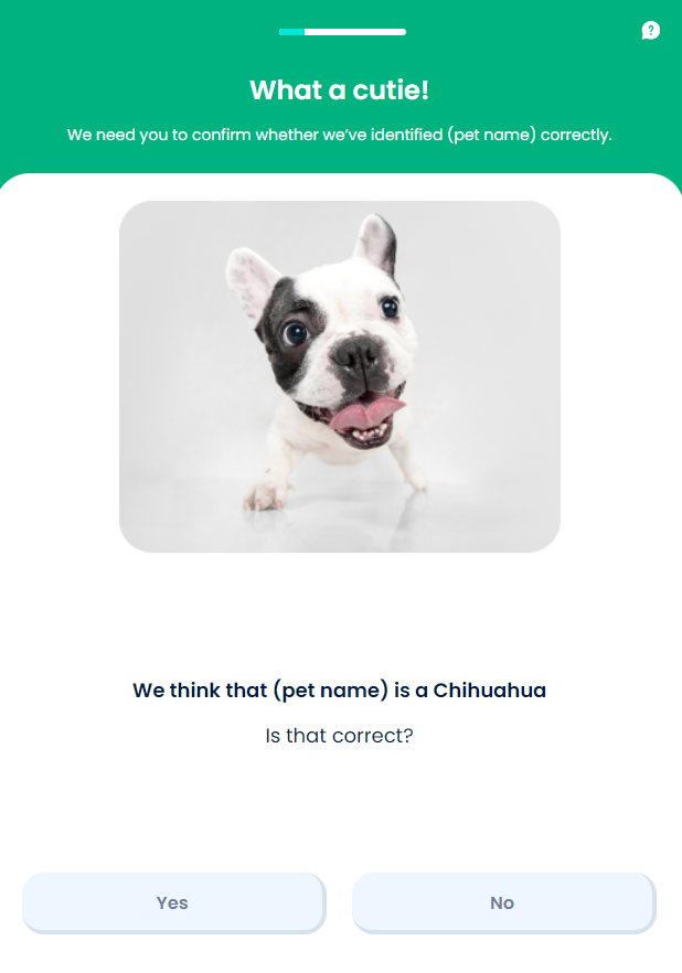 | Supporting text | The following supporting text is displayed under the heading title: We need you to confirm whether we’ve identified (pet name) correctly. |