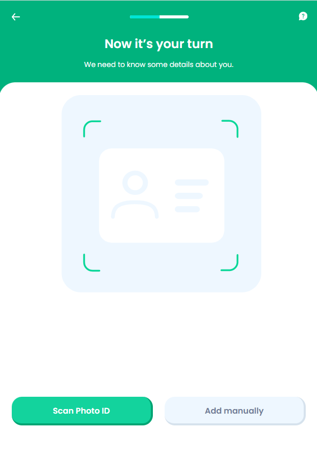 This screen allows the pet owner to choose a method of input for entering personal details, required for issuing of the policy covering their pet. The user can choose between ID scanning or manually adding the details. ID scan is emphasized on the screen by color choice (happy path green), since this is the easier way of entering the pet owner details in the system. The FintechOS ID scan processor is also used to validate the ID of the potential customer. For this step, the values inserted by the user are stored in the Retail Applicant Data entity.