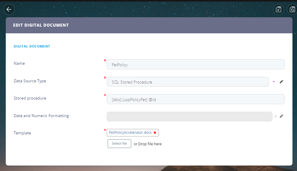 The Edit Digital Document page is displayed. Here you can add your own Pet Insurance Certificate template.
