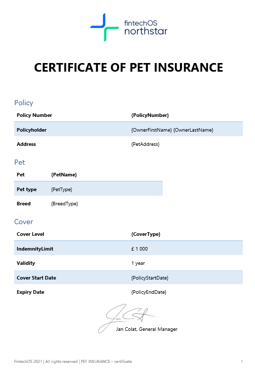 Field Example Name PetPolicy Data Source Type SQL Stored Procedure Stored procedure [dbo].[uspPolicyPet] @Id Date and Numeric Formatting N/A Template PetPolicyAccelerator.docx Below is an example of the generic Pet Insurance Certificate template document that you have in FintechOS Studio: