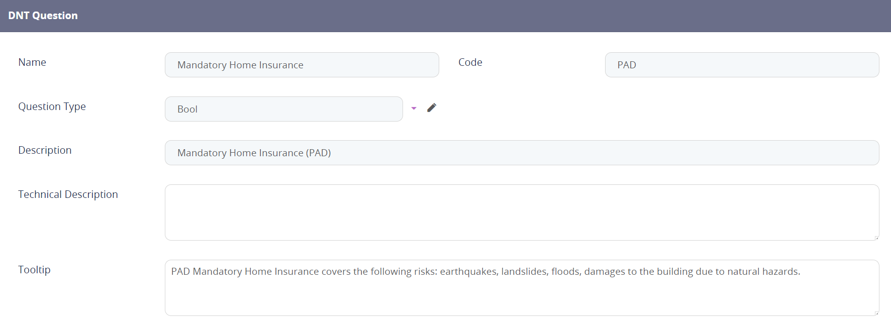 Field Description Name The DNT question name to be displayed in the Quote&Bind application. Code Assign a code to the DNT question. Question Type From the drop down, select the bool type of the question used in order to define the implied audiences. Description Free text field to input a description for the created question. Technical Description Input a technical description for the created question, if needed. Tooltip This field holds the description of the DNT Question from a customer point of view, that appears when the user hovers over the question. -