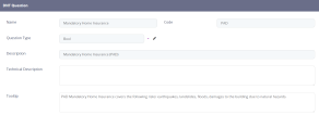 Field Description Name The DNT question name to be displayed in the Quote&Bind application. Code Assign a code to the DNT question. Question Type From the drop down, select the bool type of the question used in order to define the implied audiences. Description Free text field to input a description for the created question. Technical Description Input a technical description for the created question, if needed. Tooltip This field holds the description of the DNT Question from a customer point of view, that appears when the user hovers over the question. -