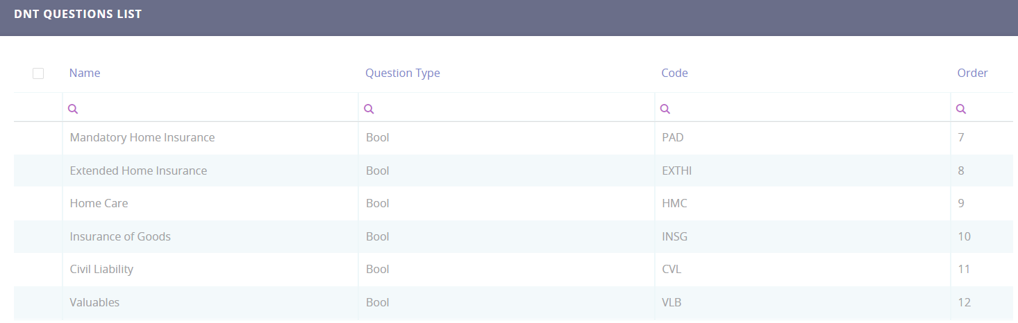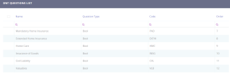 In this section, you can configure the DNT Questions that are further added in the DNT Questions grid when configuring the quote. These are then displayed in the application, and the offer is customized according to the customer's answer to the demands and needs test questionnaire.