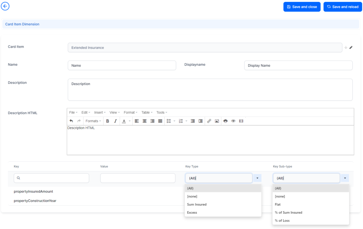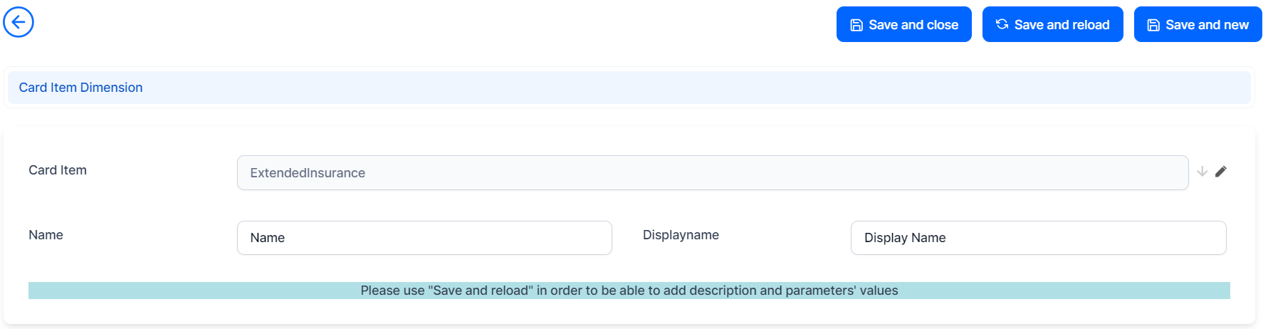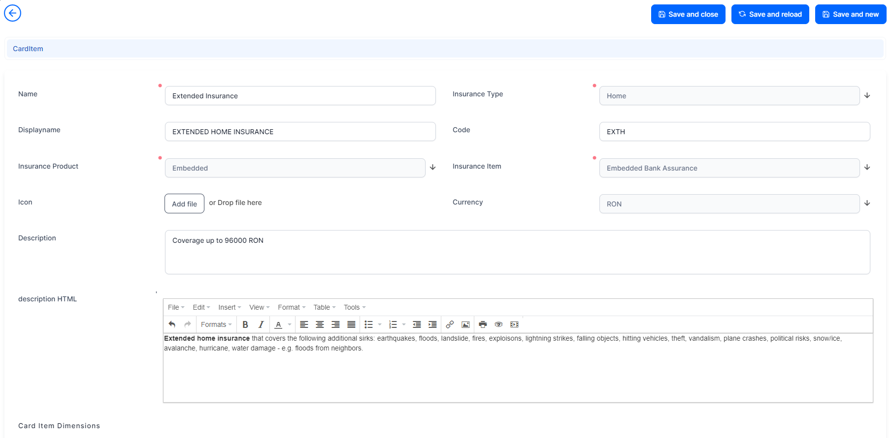 Field Description Name The name set of the card item. Insurance Type Choose the type of insurance from the option set. The insurance type needs to be pre-configured as per the steps detailed here. Display Name Input the name of the card item to be displayed in the user interface, in the Quote&Bind offer cards. Code Assign a code for the card item in order to make it easily recognizable. Insurance Product The correlated insurance product. Insurance Item The correlated insurance item. Icon Upload an icon which will appear in the offer card near its item, in the Quote&Bind application. Currency The currency set for the insurance item according to which the premium amount is calculated taking into account the exchange rate in case of other currencies in the Quote&Bind bidding process. Description Free text field to describe the configuring card item. Description HTML Specific area for describing the card item, description which is displayed in the Quote&Bind application when clicking on the desired Offer Card. When selecting the desired card, the user is able to read the description for all the included card items. -