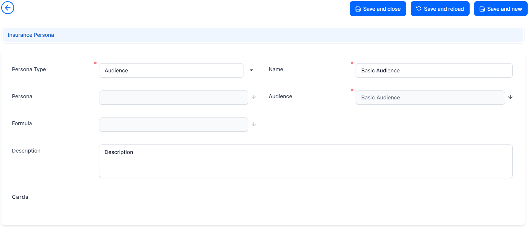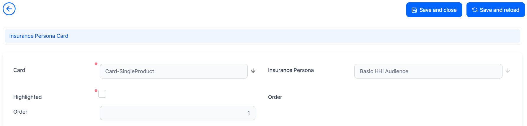 Click Save and Close. The created insurance persona card is displayed in the Cards section.