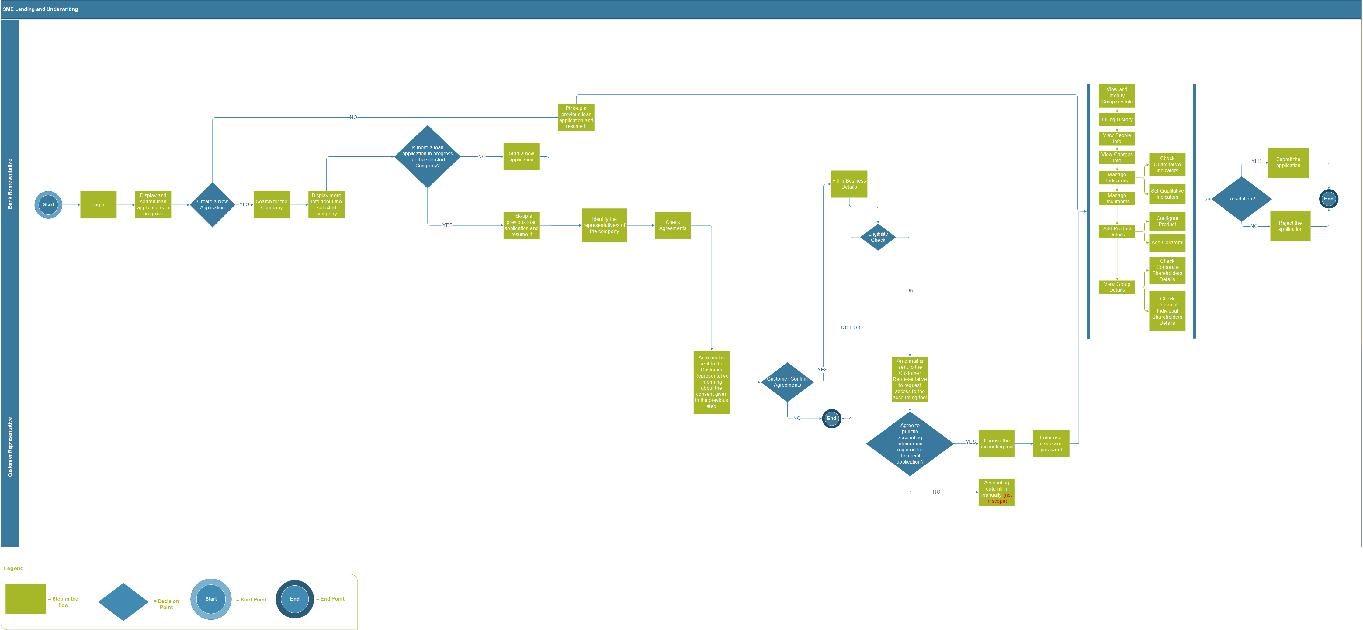 The SME Digital Lending and Underwriting accommodates several steps that enable you as a bank representative to operate the customer's application. This part of the process has the role of collecting data about the SME customer and the SME customer representative. The following data is collected: general company information, company documents and charges, details of officers and persons with significant control, group details, company indicators, as well as product details.