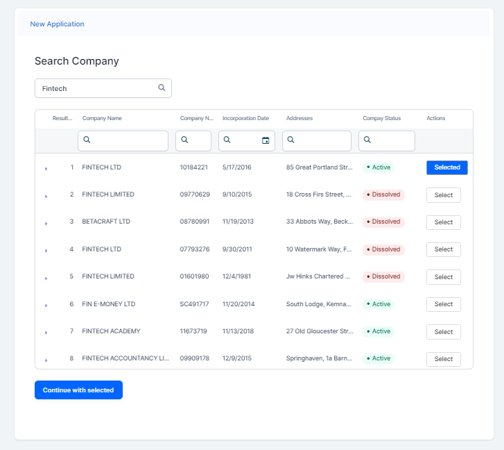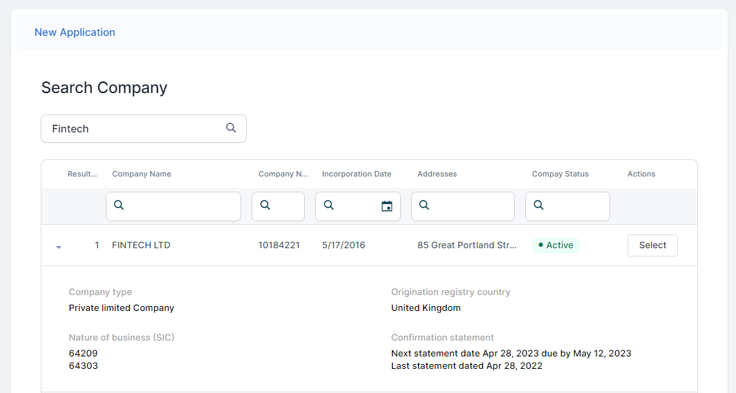 When creating a New Application from the Dashboard, you can search for an existing company to find the SME company's identification details. The solution uses integrations that bring data from external sources, such as Companies House Connector. This connector queries the Companies House database to find public information about companies and their representatives in the United Kingdom.