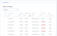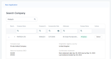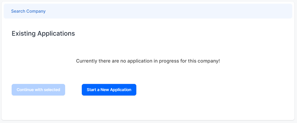 On the New Application screen, enter the company identification number or the company name in the Search Company box, to find the company for which you want to start an application. You have to enter a minimum of 5 characters to perform the search.