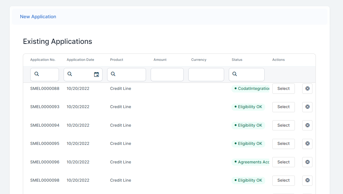 On the newly displayed Existing Applications page, you can view all the applications available for the SME customer with the following details: Application Number, Application Date, Product, Amount, Currency, Status, and Actions. Select one of the available applications and click Continue with selected.