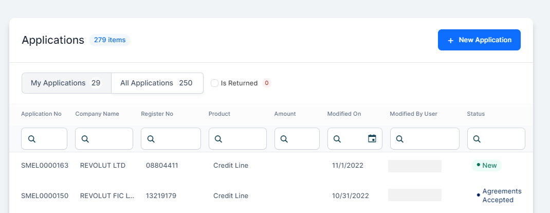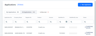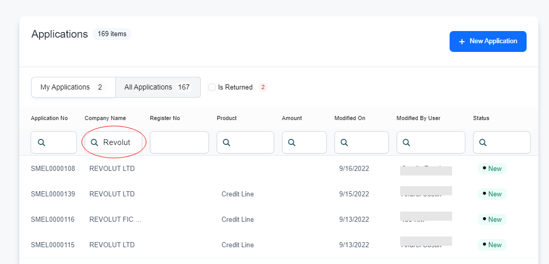 The following details are displayed: Application Number (a unique number with the prefix SMEL), Company Name, Register Number (a unique business identifier of the company ), Product (the name of the product accessed by the customer), Amount (the requested loan amount), Modified On (the date of the last modification), Modified by User (the last user who made the change), and Status (the current status of the application).