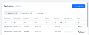 View, filter, and open existing credit applications for your customers in the Applications section.