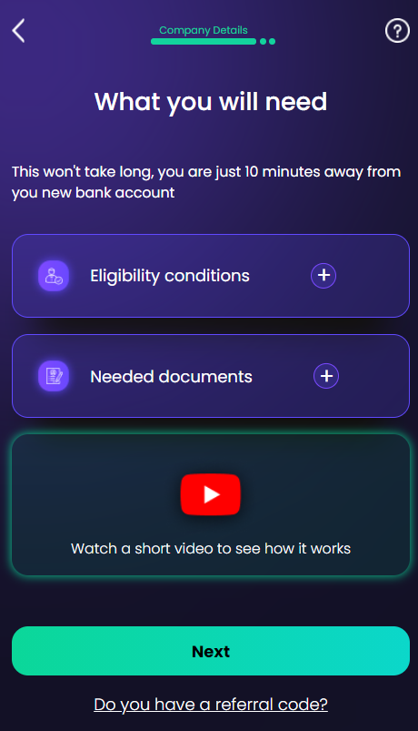 The first screens explain the requirements for eligibility and the steps of the flow to open an account successfully. An overview about the flow, the mandatory requirements to be fulfilled to receive the disbursement are displayed. Click Get Started.