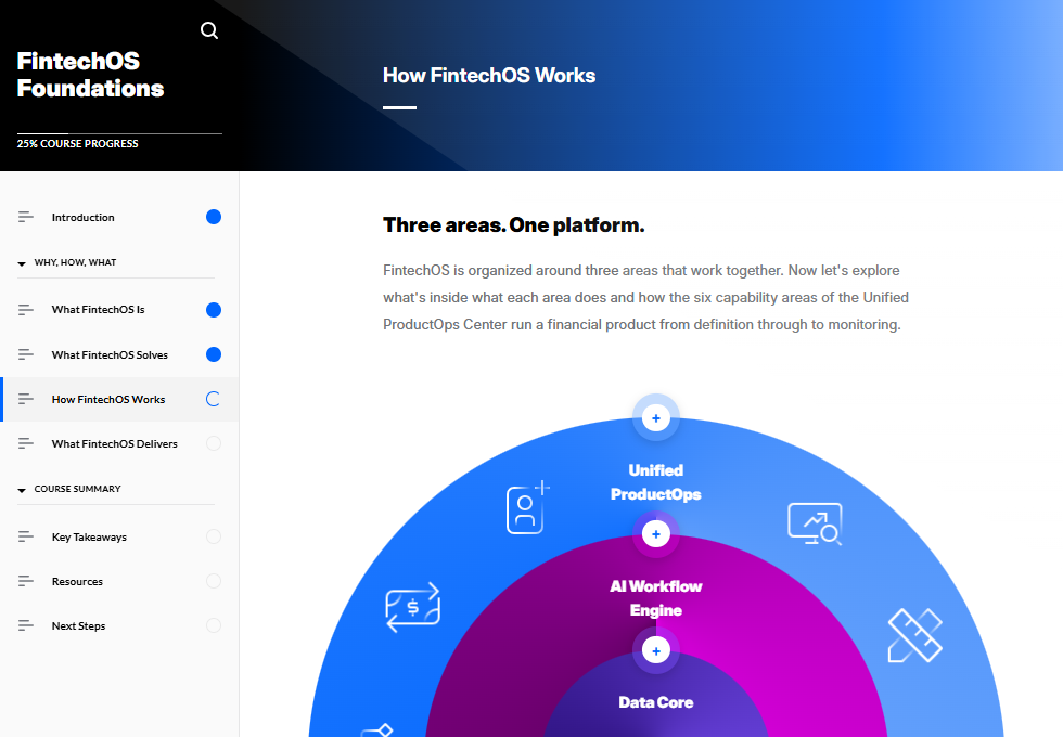 FintechOS Academy The Academy has all the resources and support to take your career to the next level. Empowering you with the skills to be at the forefront of digital transformation and shape the future of financial services.