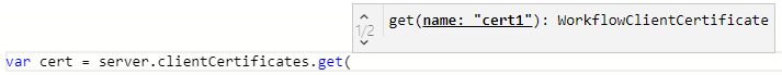 In the code editor, the server.clientCertificates.get function provides automatic code completion suggestions for the registered client certificates.