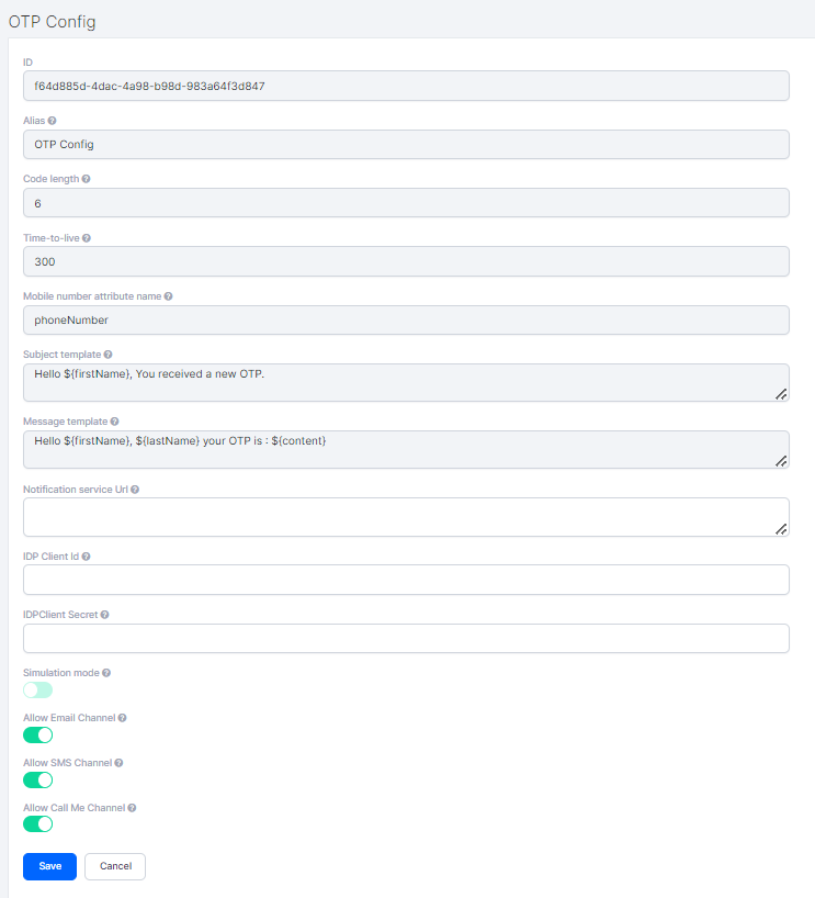 - Simulation mode: When set to True, the actual one-time password will not be sent to the user. Instead, the one-time password will be logged on the FintechOS Identity Provider server.