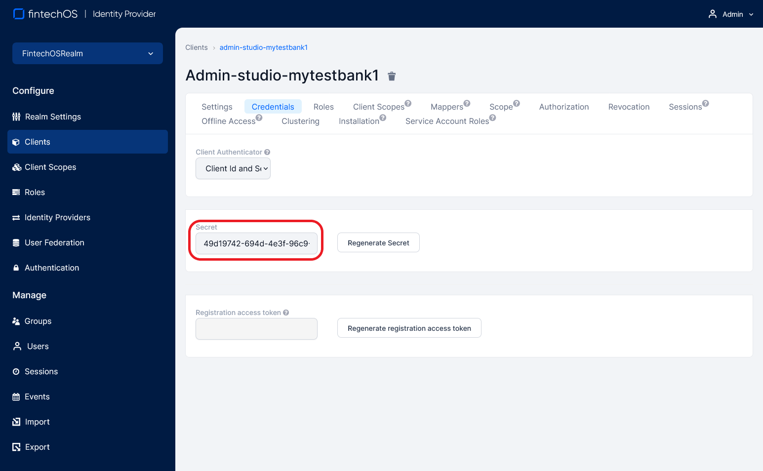 | openid-client-secret | Your FintechOS Platform component's corresponding client secret generated by the FintechOS Identity Provider. In the FintechOS Identity Provider admin console, you can find the client secret in the Credentials tab of your client's page. |