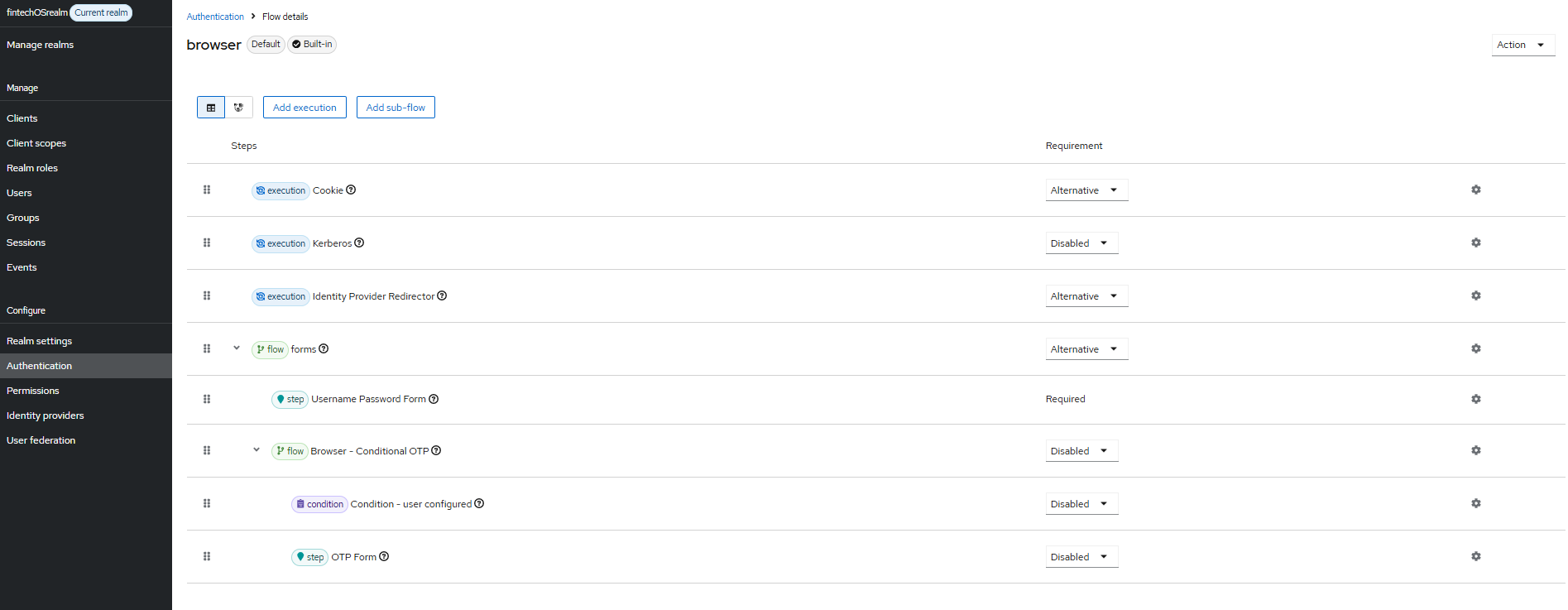 - In the Flows tab, open a built-in authentication flow and alter its requirements. Built-in flows cannot be modified, but you can alter its settings such as OTP forms, conditions, and so on. You might have multiple flows depending on authentication scenarios, such as an authentication flow for existing users, a registration flow, a reset credentials flow and so on. Read more about authentication flows in the official Keycloack documentation.
