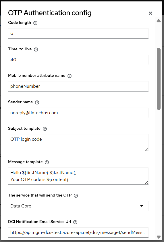 - Simulation mode: When set to True, the actual one-time password will not be sent to the user. Instead, the one-time password will be logged on the FintechOS Identity Provider server.