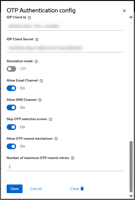 Allow OTP resend mechanism: allows the user to request another OTP code. The number of retries is configured in the below box Number of maximum OTP resend retries.