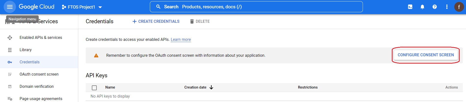 Go to the Credentials tab and select CONFIGURE SELECT SCREEN. This step is mandatory for the integration and it configures what the users see when they are redirected to Google for signing in.