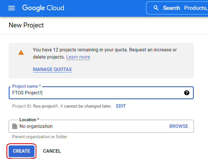 Select CREATE PROJECT and provide a Project Name, then select CREATE.