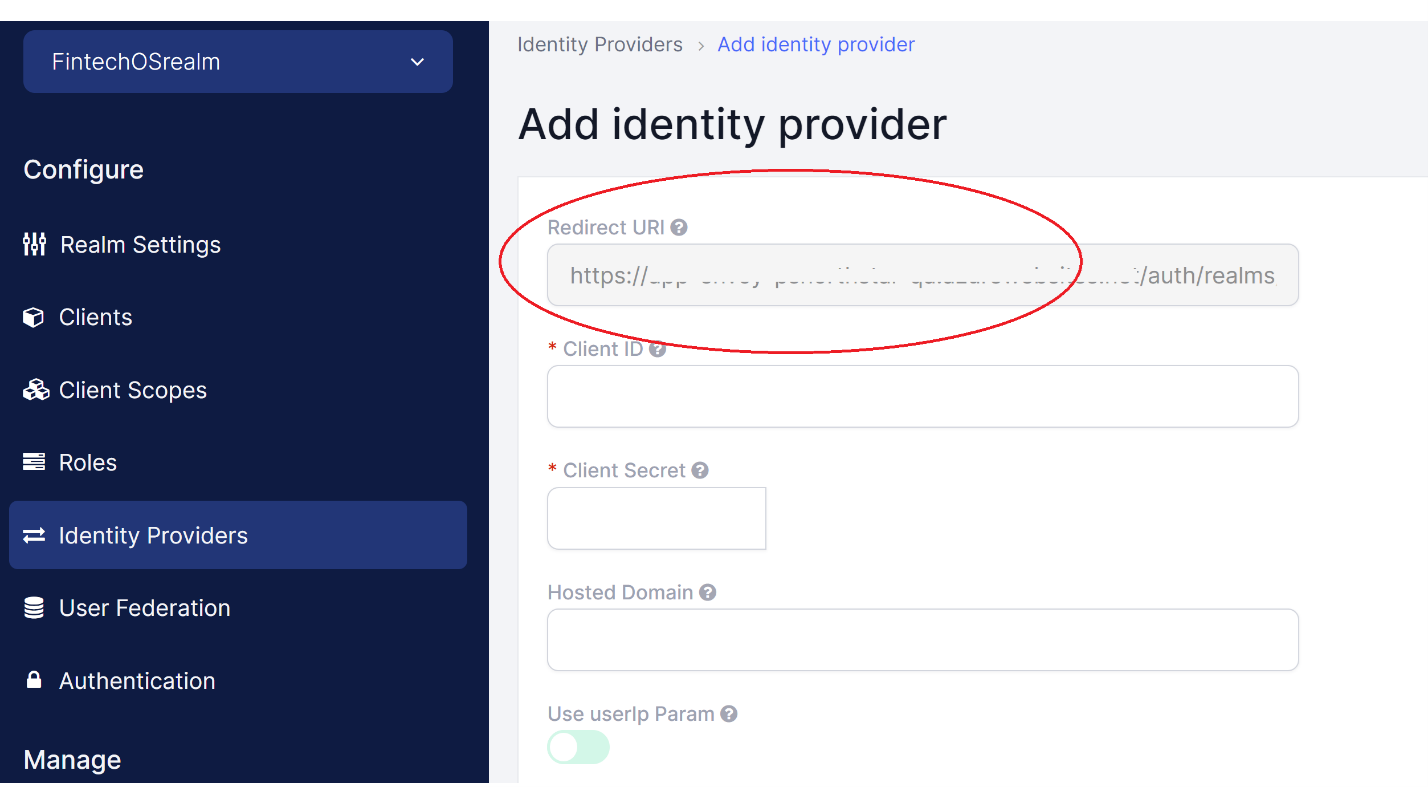 https://{HPFI base URL}/auth/realms/{realm name}/broker/{alias}/endpoint.IMPORTANT! The Redirect URI value should match the FintechOS platform IDP. If this field is not correctly configured, the authentication process will return an error.