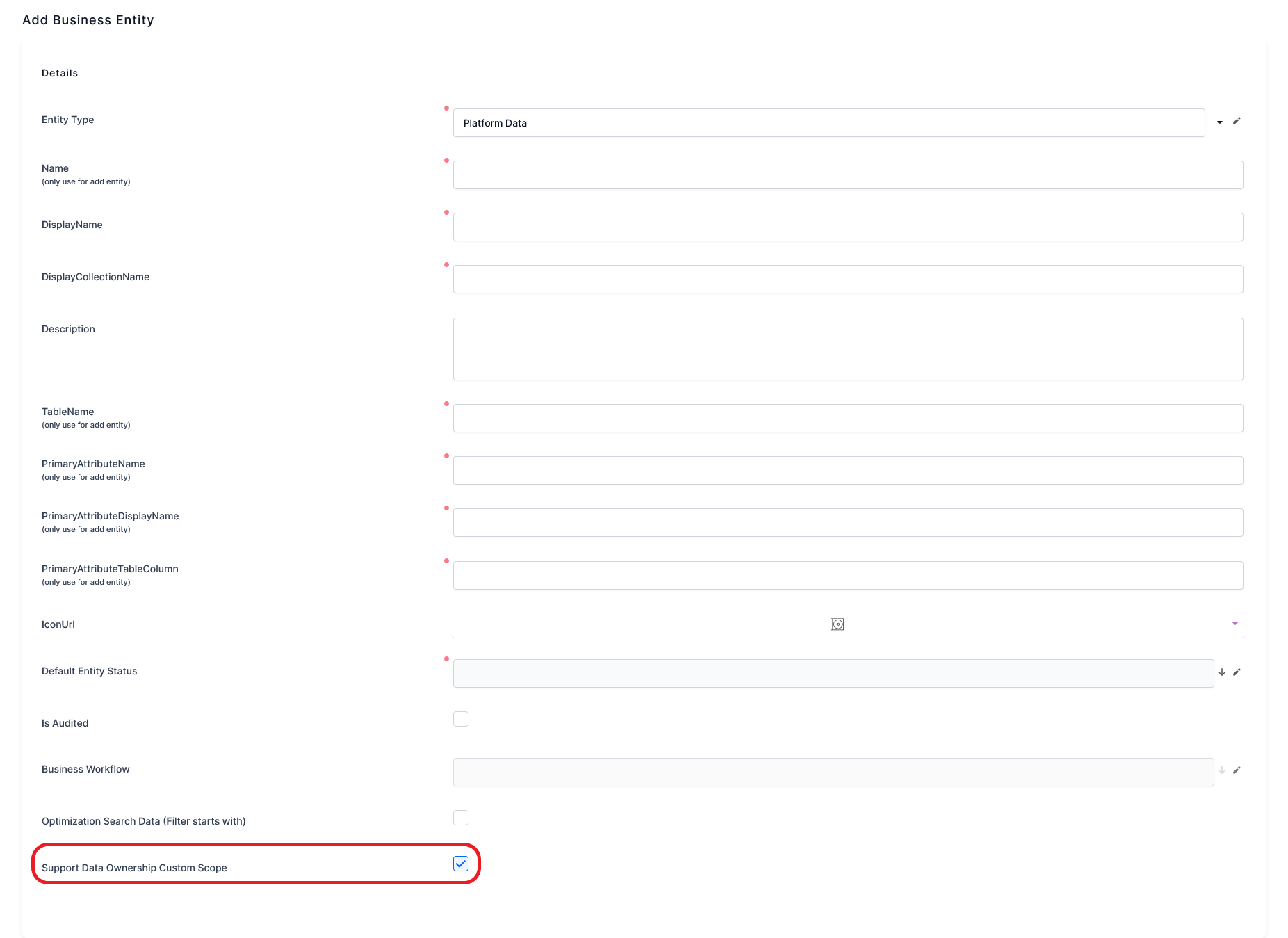 A new Support Data Ownership Custom Scope option has been added to the business entity editor. This enhancement enables you to programatically assign specific users access to particular entity records. By creating custom data ownership tags, you can associate these tags with the relevant user accounts and the entity records they are permitted to access.