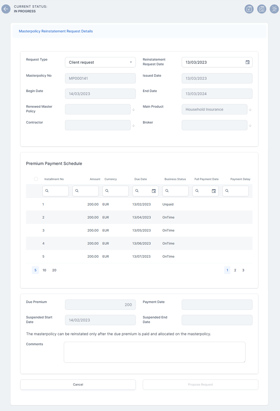 The master policy reinstatement can be done either manually or automatically. The latter happens when a payment is allocated on an installment that is due, where the Payment Date is less than the Due Date of the previously unpaid installment. Read more by accessing the Reinstate a Master Policy page.
