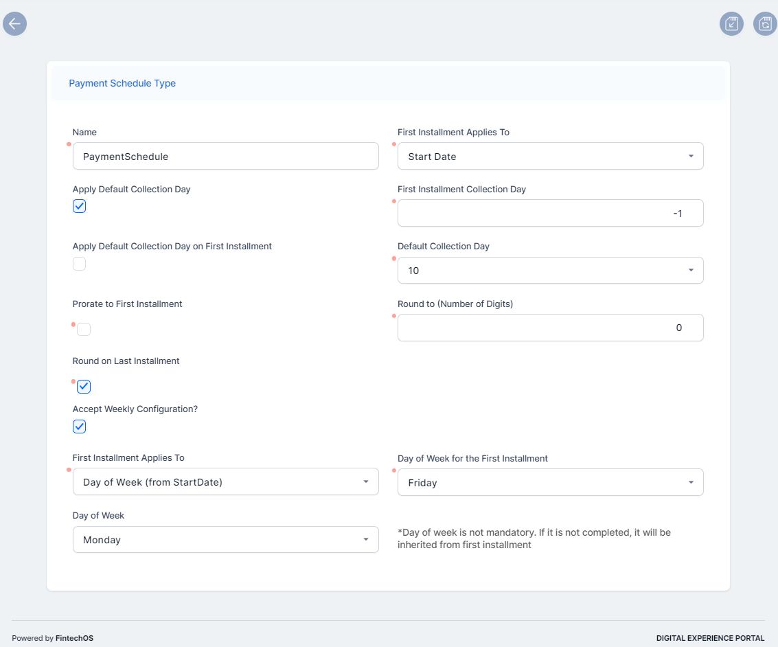 In FintechOS Portal you can add and configure payment schedule types, to define and set details pertaining to the way the payment schedule works for the product, like when the first installment and subsequent installments default due dates, digits rounding rules, and more. Once payment types are configured, they can be selected to apply to one or more products within the product definition.