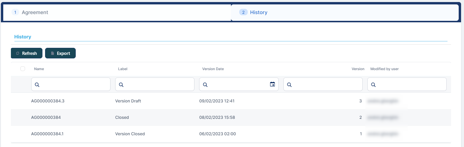 You can view the versions of the agreement, their workflow status, the version creation date, and the user who modified the record, in the third-party agreement's History tab. This tab only appears after saving the agreement record.