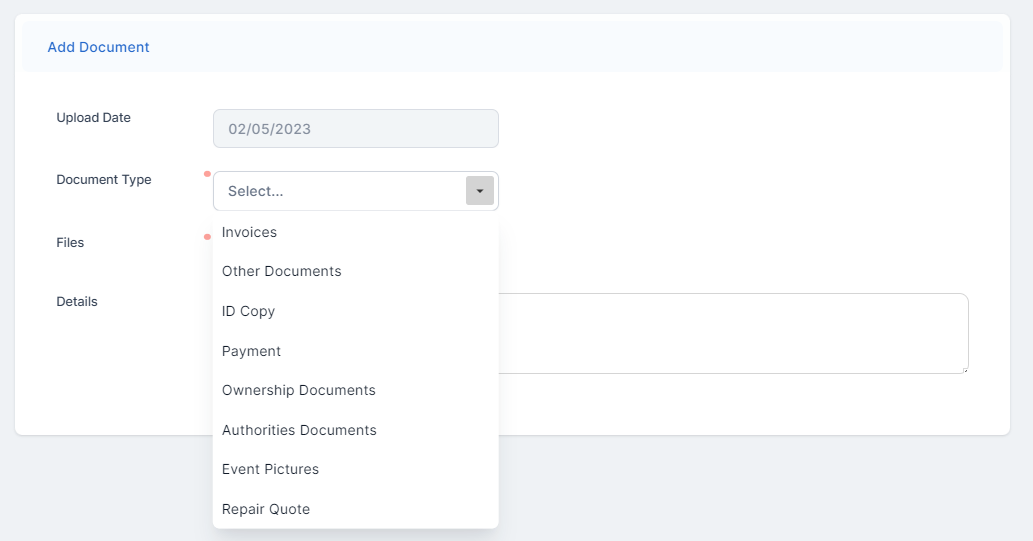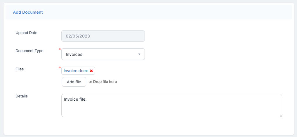 Choose the Document Type, click Add file to insert the document, and write any details, if necessary.