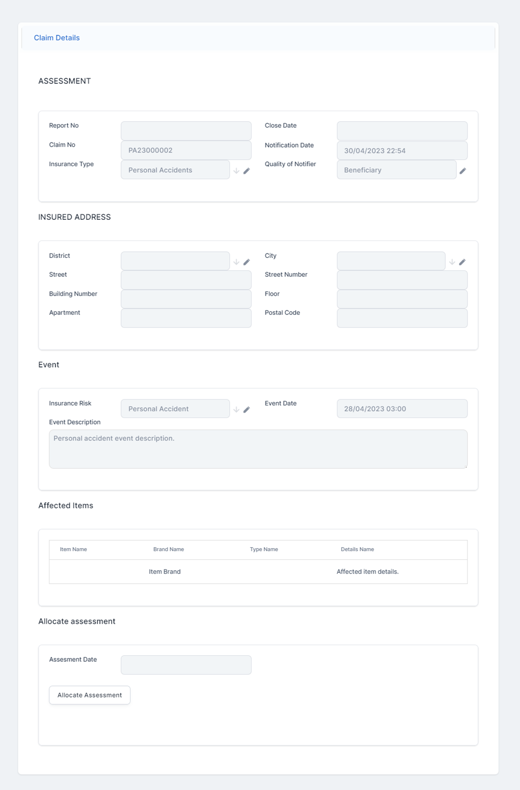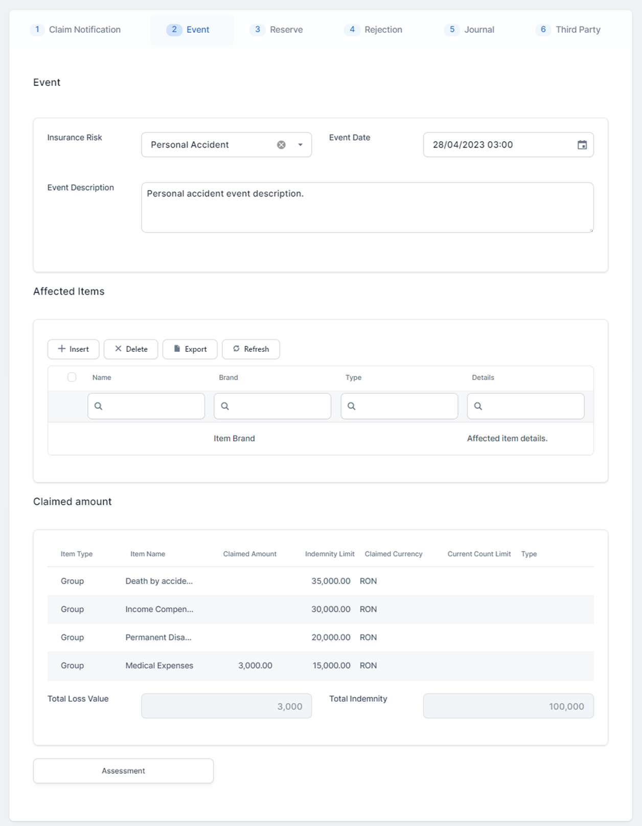 Go to the second tab, Event. Here is where you find the details about the event, the affected items and the claimed amount that you have input in the FNOL form. These sections are editable and you can make any changes to them.