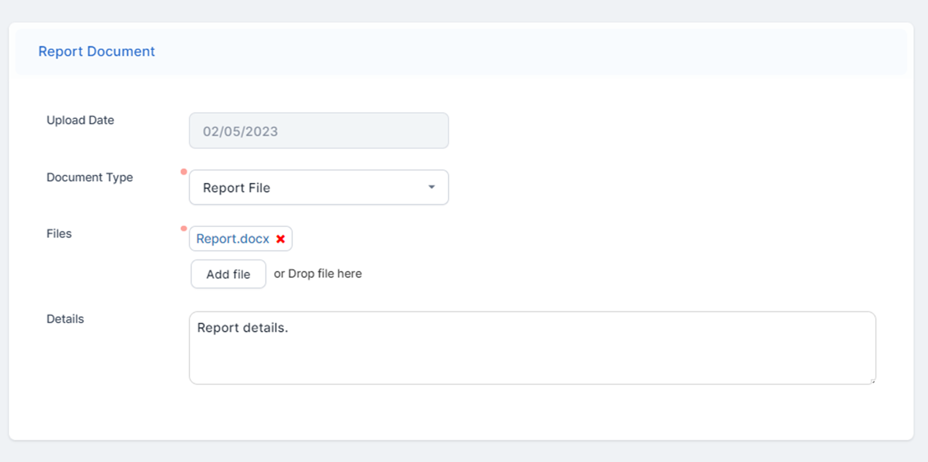 Select the Document Type from the drop-down, and click Add file to upload the report file.