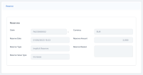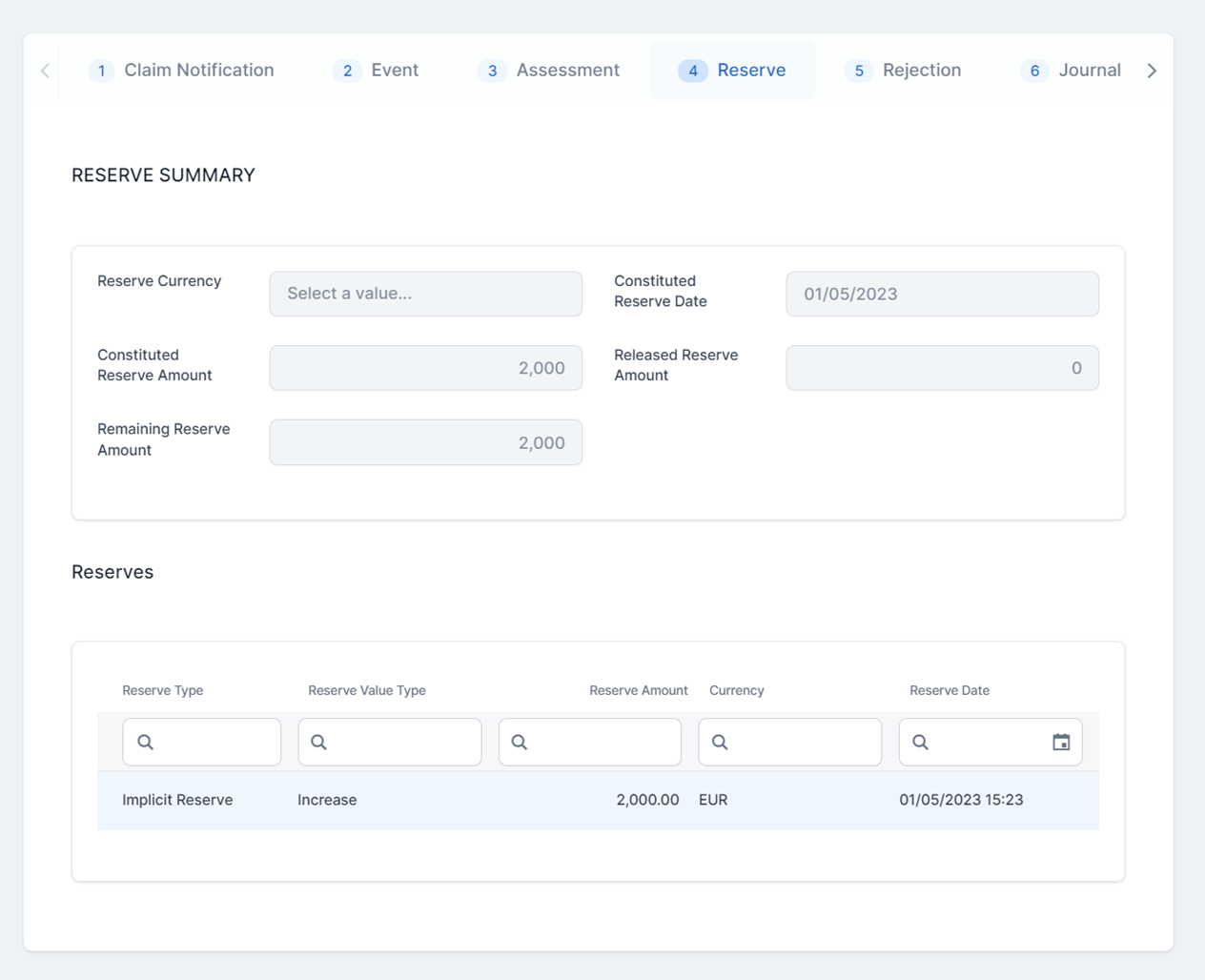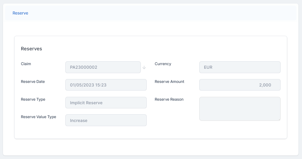 Go to the fourth tab, Reserve. Here is where you find details about the reserve date and amount. In the Reserves grid, you can view the record's details, including the claim currency, date, amount and the reserve type and value type.