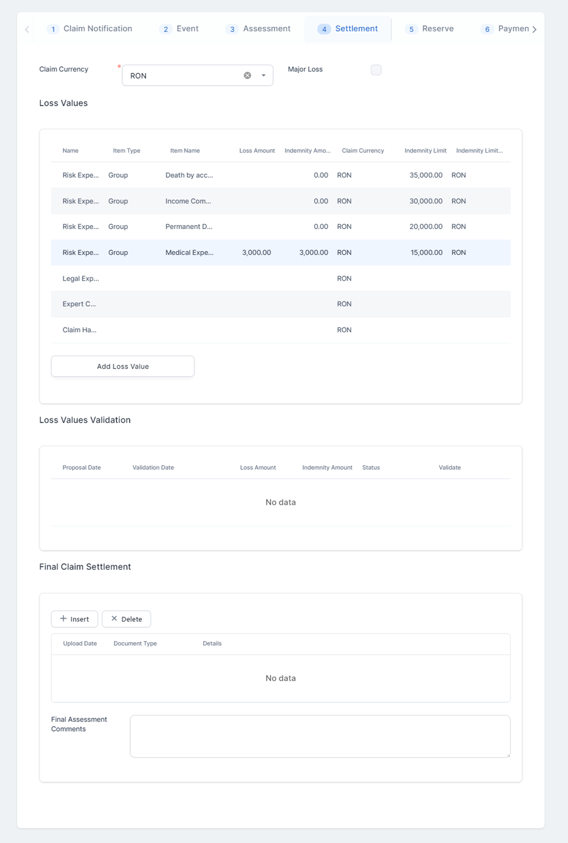 Go to the Settlement tab and choose the Claim Currency. In the Loss Values grid, input a Loss Amount for a risk.