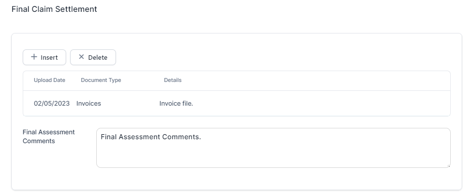 In the Final Claim Settlement grid, click Insert to upload the file for the settlement.