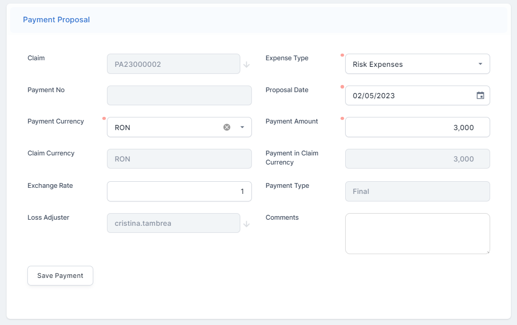 - Choose the Expense Type from the drop-down, choose the Payment Currency and input the Payment Amount. If you input a value less than the loss value, then the Payment Type is Partial. If you input the whole loss value amount, then the Payment Type is full.