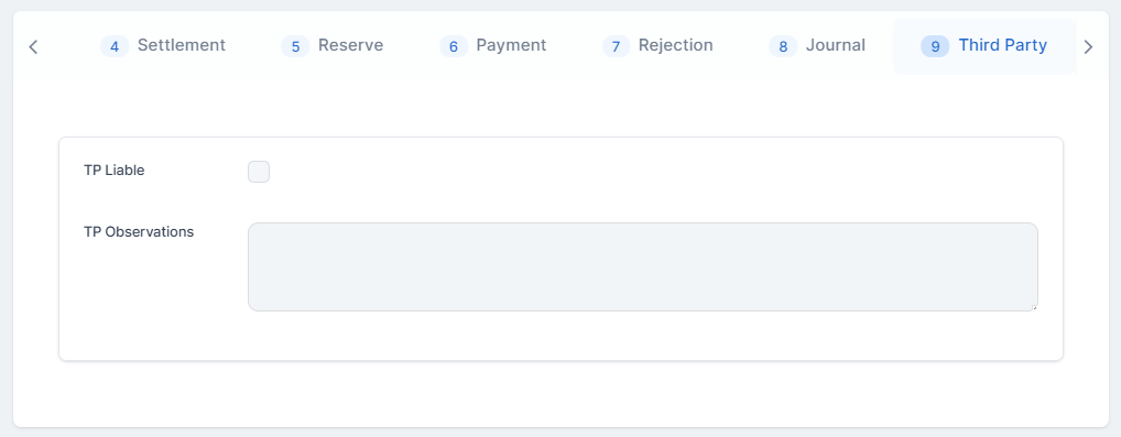 In the Third Party tab, you can see if the claim has been set to be TP Liable in the FNOL form, and view any observations that have been made.