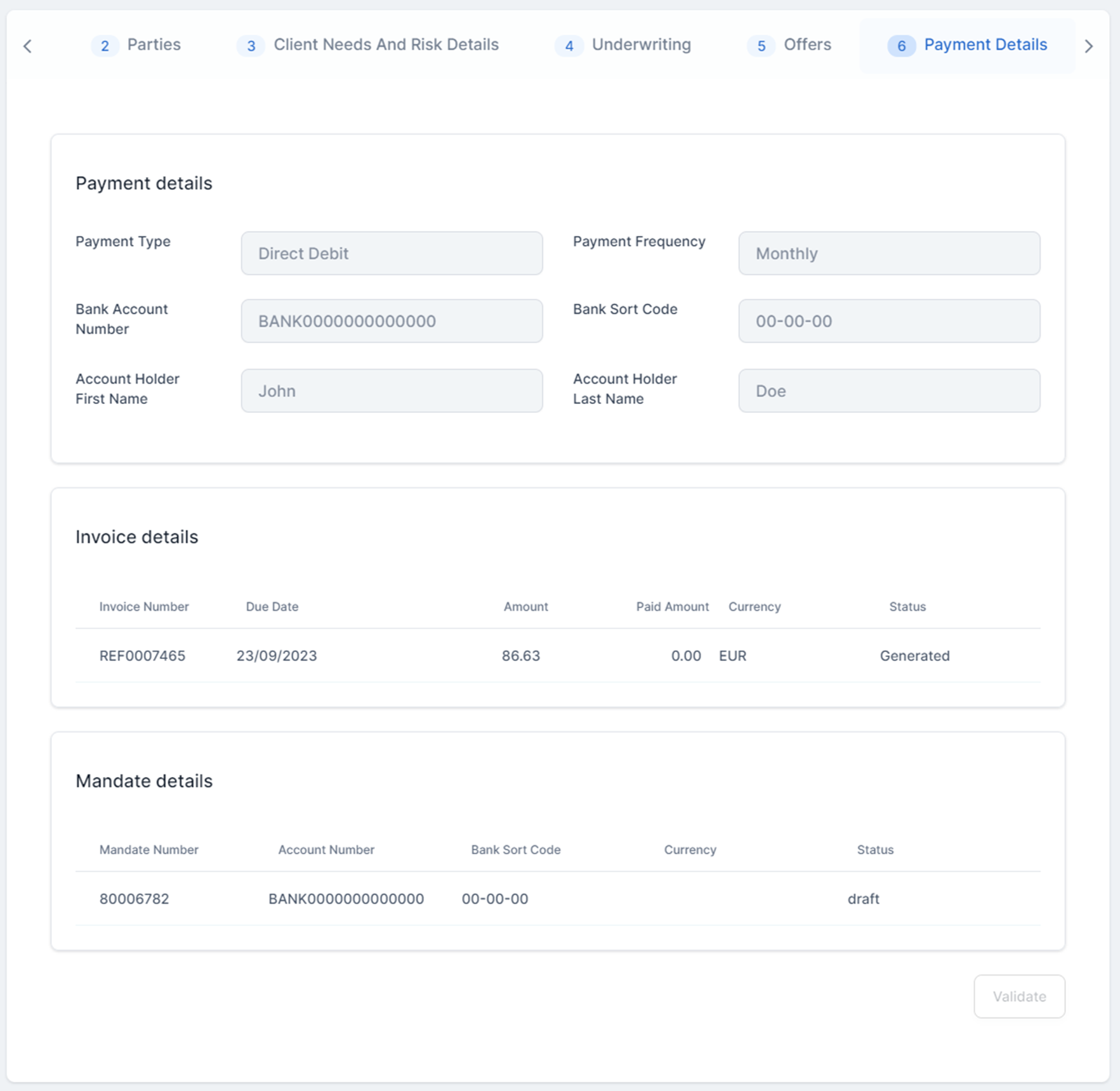 Click Validate. The invoice and the mandate details are generated, and displayed in the newly unfolded Invoice details and Mandate details sections of the tab.