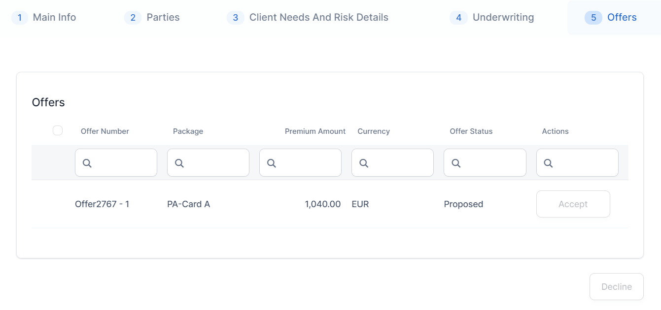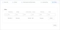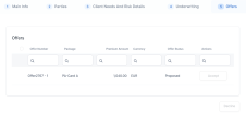 Click the fifth tab, Offers. This section contains the records of all the quote offers made for the beneficiary, and they can choose to either Accept or Decline them.