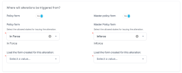 In the next section, Where will alterations be triggered from?, define if you want the alterations to be triggered from the policy form or from the master policy form. In both cases, if the fields are checked, a new section is displayed where you can select in which policy or master policy status the alteration can be issued. Also, select an alteration form driven flow to apply in this case. You can choose an existing flow, or create a new one, and select it.