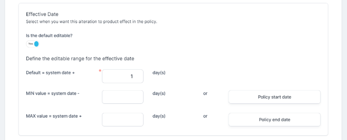 Configure the Effective Date of the alteration, and select when you want this alteration to product effect in the policy. If you check the Is the default editable? field, a new section unfolds where you can define the editable range for the effective date.