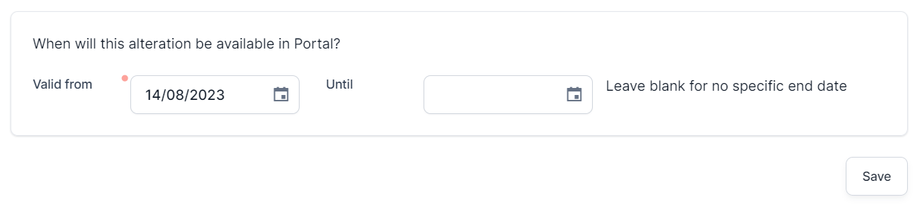 In the last section, When will this alteration be available in Portal?, define the validity time frame of the alteration. Choose a date for the Valid from and for the Until fields. You can leave the last field blank for no specific end date.