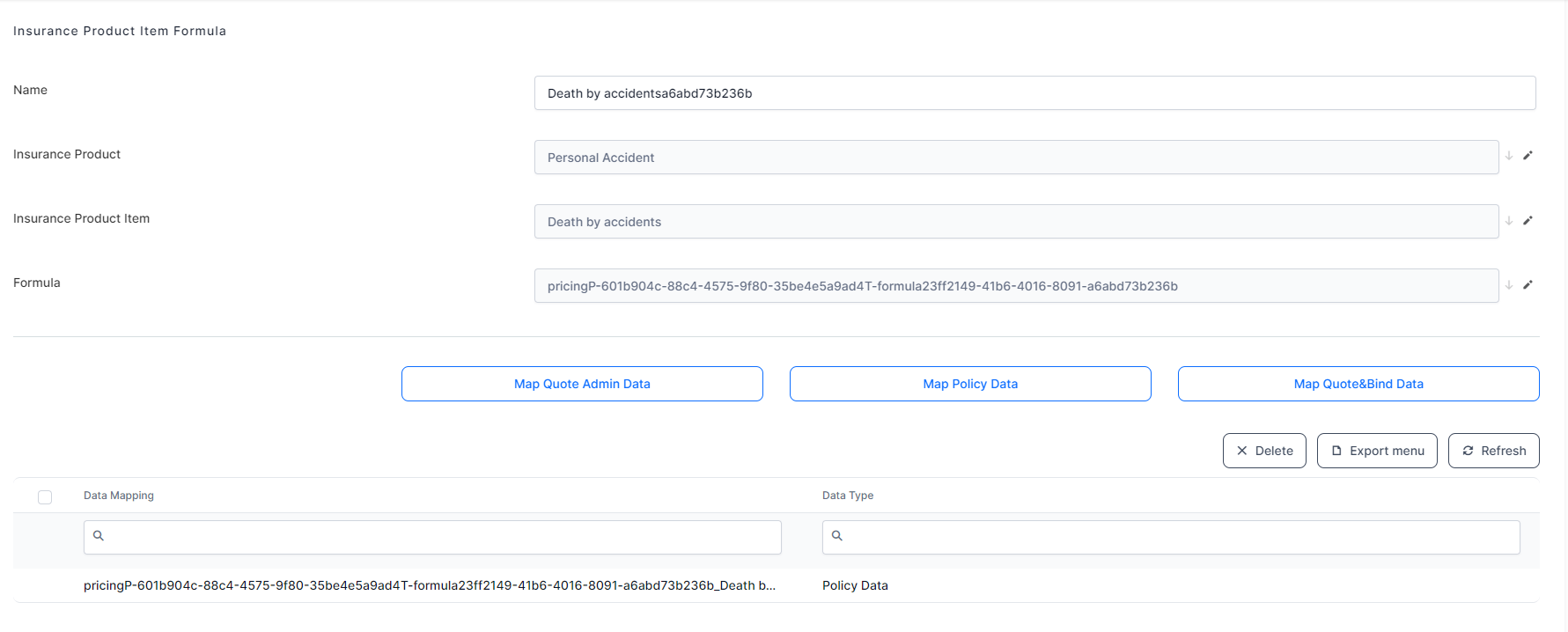 On the newly displayed Insurance Product Item Formula page for the selected formula, you can decide to map the formula against attributes from the data models of Quote Admin, Policy Admin, or Quote&Bind, clicking the respective buttons. In the context of Policy Administration, click Map Policy Data.