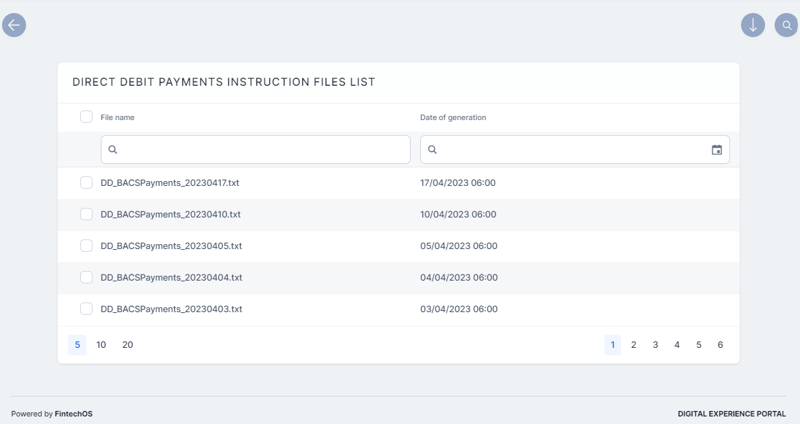 In FintechOS Portal, go to Main Menu > Billing & Collection > DIDE SEPA > Payment Instruction Files. The list of all direct debit payments instruction files records is displayed.