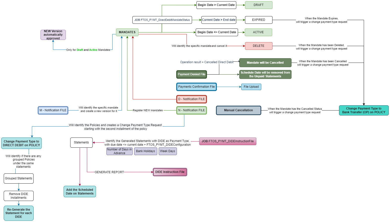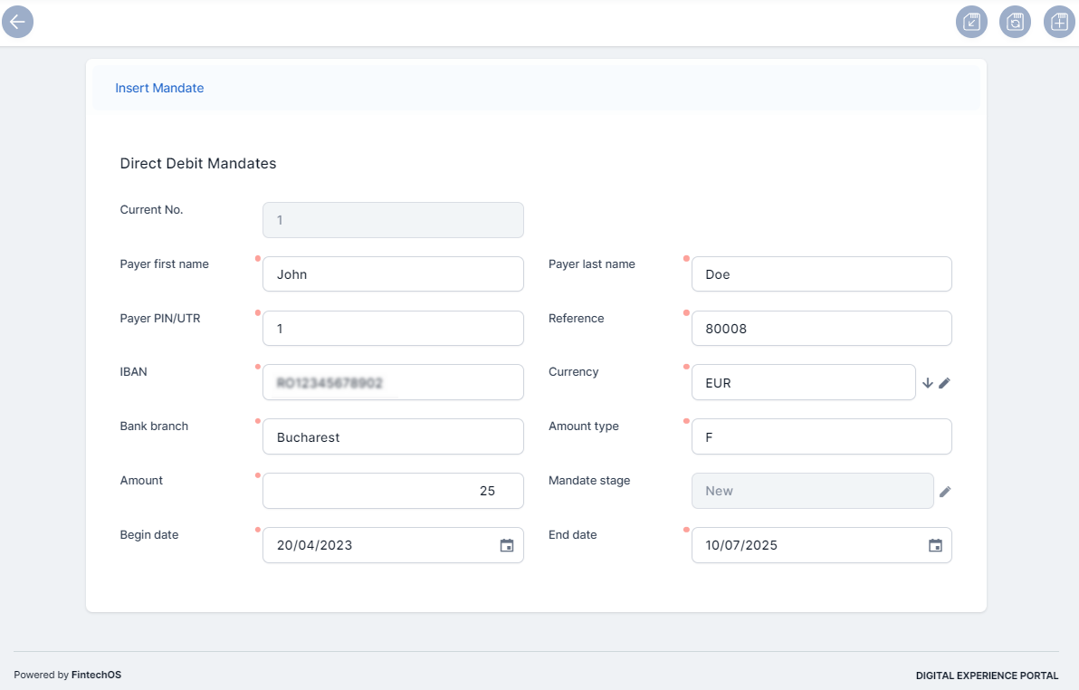 Even if rare, there are cases when you need to manually insert a mandate, on behalf of a customer. All mandates inserted manually are registered in Draft status, with mandateStage =N (new) and Begin Date = null. Next, for all the mandates egistered in the system, the FTOS_PYMT_DirectDebitMandateStatus scheduled job moves the mandate in Active status, based on set rules.