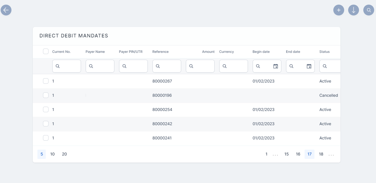 In FintechOS Portal, go to Main Menu > Billing & Collection > DIDE SEPA > Direct Debit Mandates. The list of all direct debit mandate records is displayed.