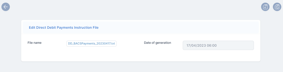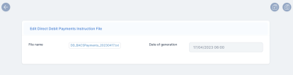 The Payment Instruction Files section contains the Direct Debit Payments Instruction Files List, which displays all the files with instructions for direct debit payments generated by the system. All the details from this section are automatically filled in by the system and they are not editable.