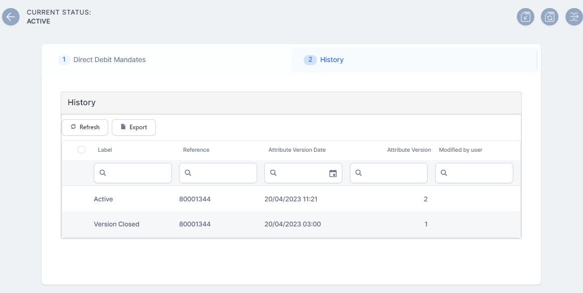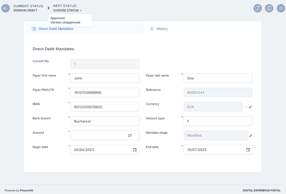 Click Save and Reload. The record is now inserted, and you can find it in the Direct Debit Mandates list. In the form, the History tab becomes available, where you can see updates of the record's version.